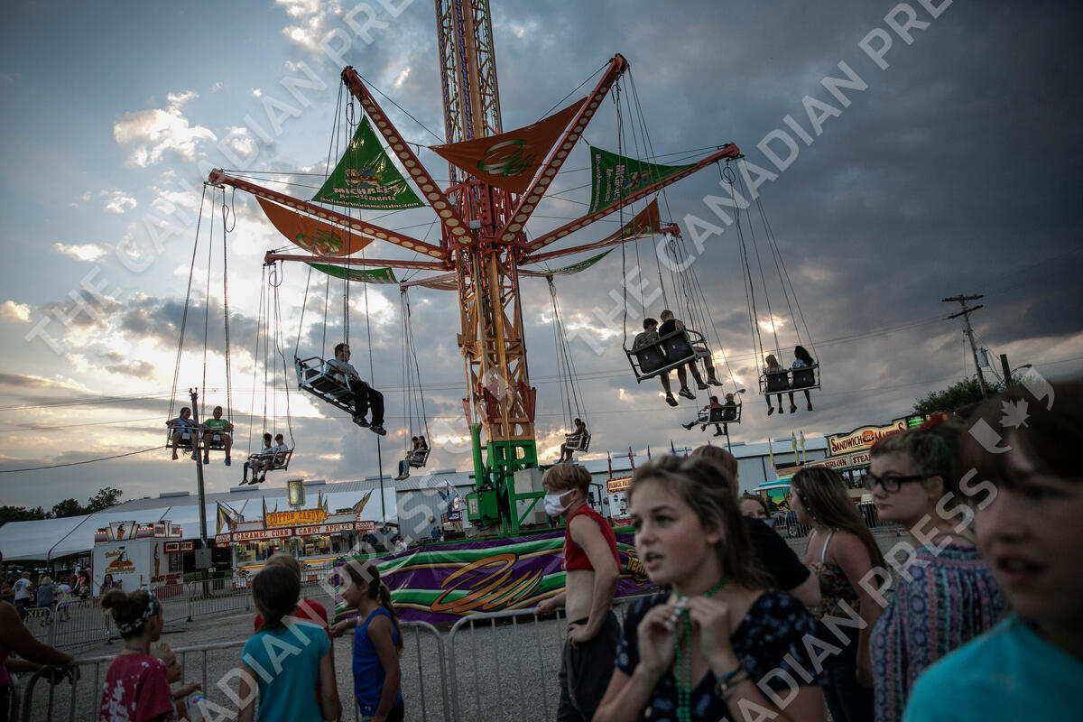 People wait to ride a revolving swing at the Perry State Fair in New Lexington, Ohio, Friday, July 24, 2020. In the towns that speckle the Appalachian foothills of southeast Ohio, the pandemic has barely been felt. Coronavirus deaths and racial protests - events that have defined 2020 nationwide - are mostly just images on TV from a distant America. (AP Photo/Wong Maye-E)