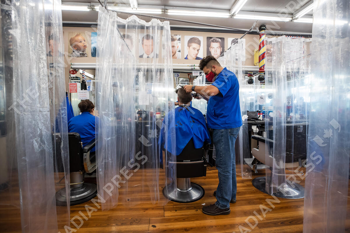 Fady Danial cuts Robert Bruce's hair at a barbershop that has erected plastic shower curtains as a measure to help curb the spread of COVID-19, in Burnaby, B.C., on Saturday, November 7, 2020. British Columbia announced new public health measures for the Vancouver Coastal Health and Fraser Health regions on Saturday - including an order for people not to have social interactions outside their immediate household and a ban on indoor group physical activities for two weeks. THE CANADIAN PRESS/Darryl Dyck