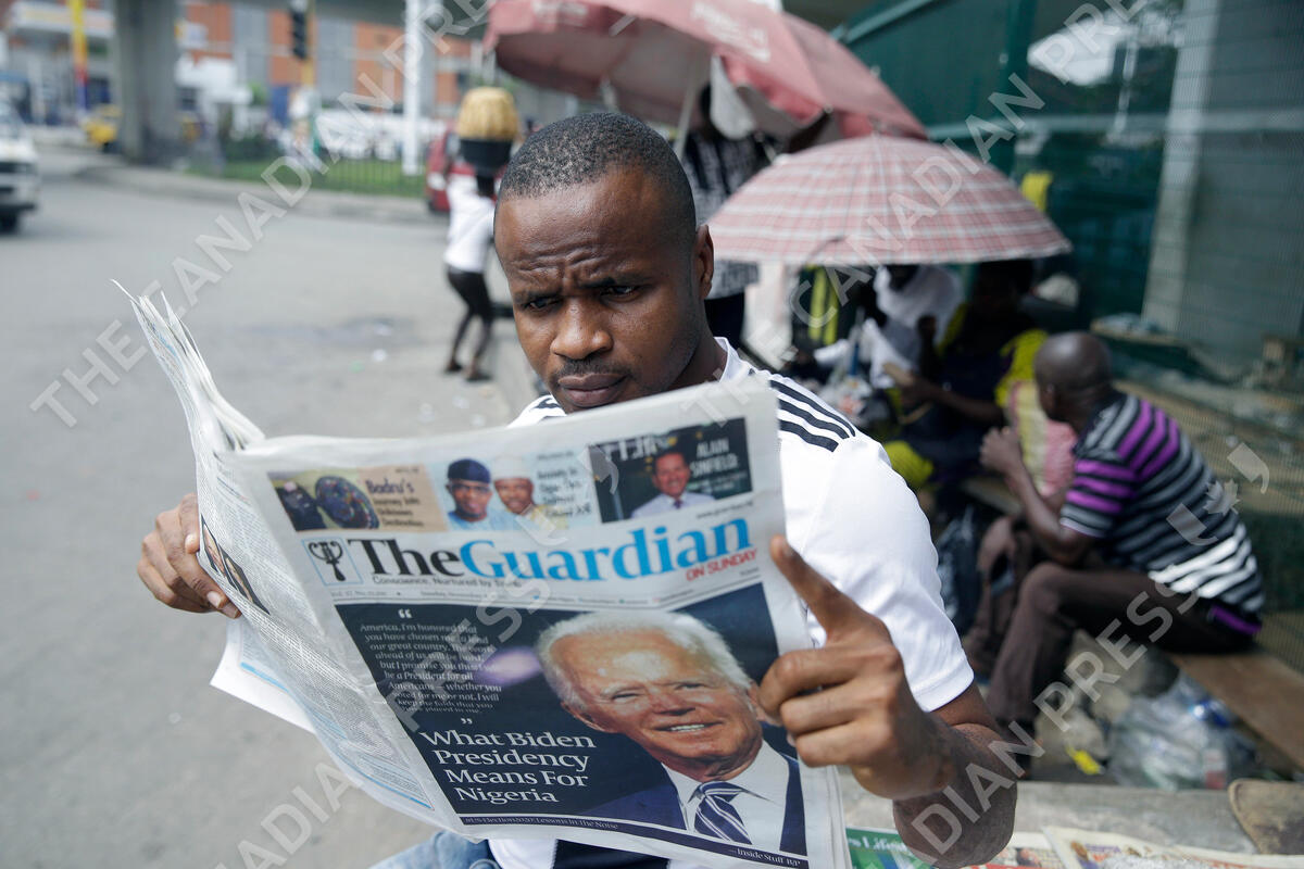 A man reads a newspapers reacting to the news of U.S President-elect Joe Biden's victory in the US presidential election, in Lagos, Nigeria, Sunday, Nov. 8, 2020. (AP Photo/Sunday Alamba)