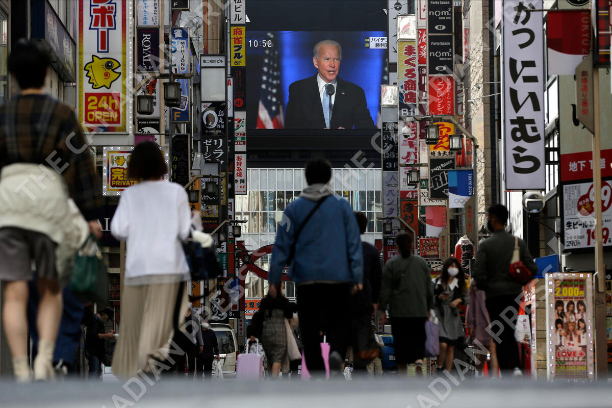 A screen shows a broadcast of President-elect Joe Biden speaking Sunday, Nov. 8, 2020 at the Shinjuku shopping district in Tokyo. (AP Photo/Kiichiro Sato)