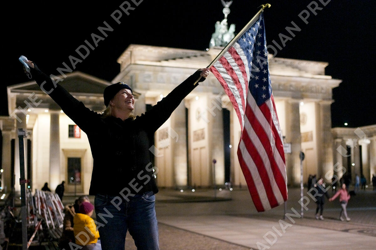 Marianne Hoenow from Connecticut in the US celebrates the victory of President-elect Joe Biden and Vice President-elect Kamala Harris in front of the Brandenbug Gate next to the United States embassy in Berlin, Germany, Saturday, Nov. 7, 2020. Biden defeated President Donald Trump to become the 46th president of the United States on Saturday, positioning himself to lead a nation gripped by the historic pandemic and a confluence of economic and social turmoil. (Photo/Markus Schreiber)