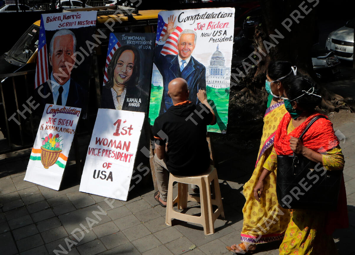 Indian art teacher Sagar Kambli makes paintings of U.S. President-elect Joe Biden and Vice President-elect Kamala Harris on a pavement outside his art school remaining closed due to the COVID-19 pandemic in Mumbai, India, Sunday, Nov. 8, 2020. (AP Photo/Rajanish Kakade)
