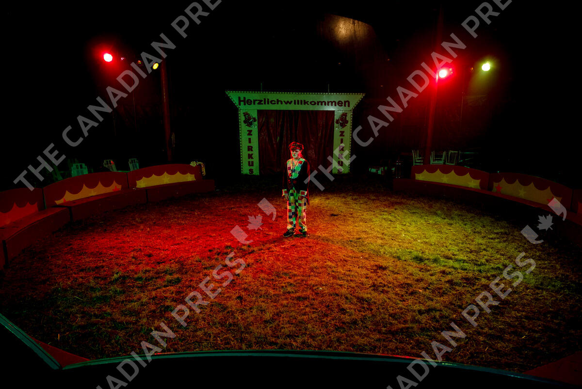 Eleven-year-old clown Angie stands in the circus ring after the last performance of small circus Delmonde at the eve of a new partial lockdown to avoid the spread of the coronavirus and the COVID-19 disease, in Frankfurt, Germany, Sunday, Nov. 1, 2020. As Germany embarks Monday on a four-week partial lockdown, the family-run circus joins theaters, cinemas, sports facilities, restaurants and bars across the country in shutting down and hoping for the best. (AP Photo/Michael Probst)