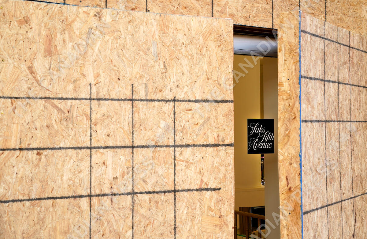 A sign for the Saks Fifth Avenue store is visible behind boarded up windows, Friday, Oct. 30, 2020, in Beverly Hills, Calif. Retailers, including Nordstrom, Tiffany and Saks Fifth Avenue, are boarding up their windows and planning to add extra security personnel in some of their locations ahead of the contentious presidential election on Tuesday. (AP Photo/Chris Pizzello)