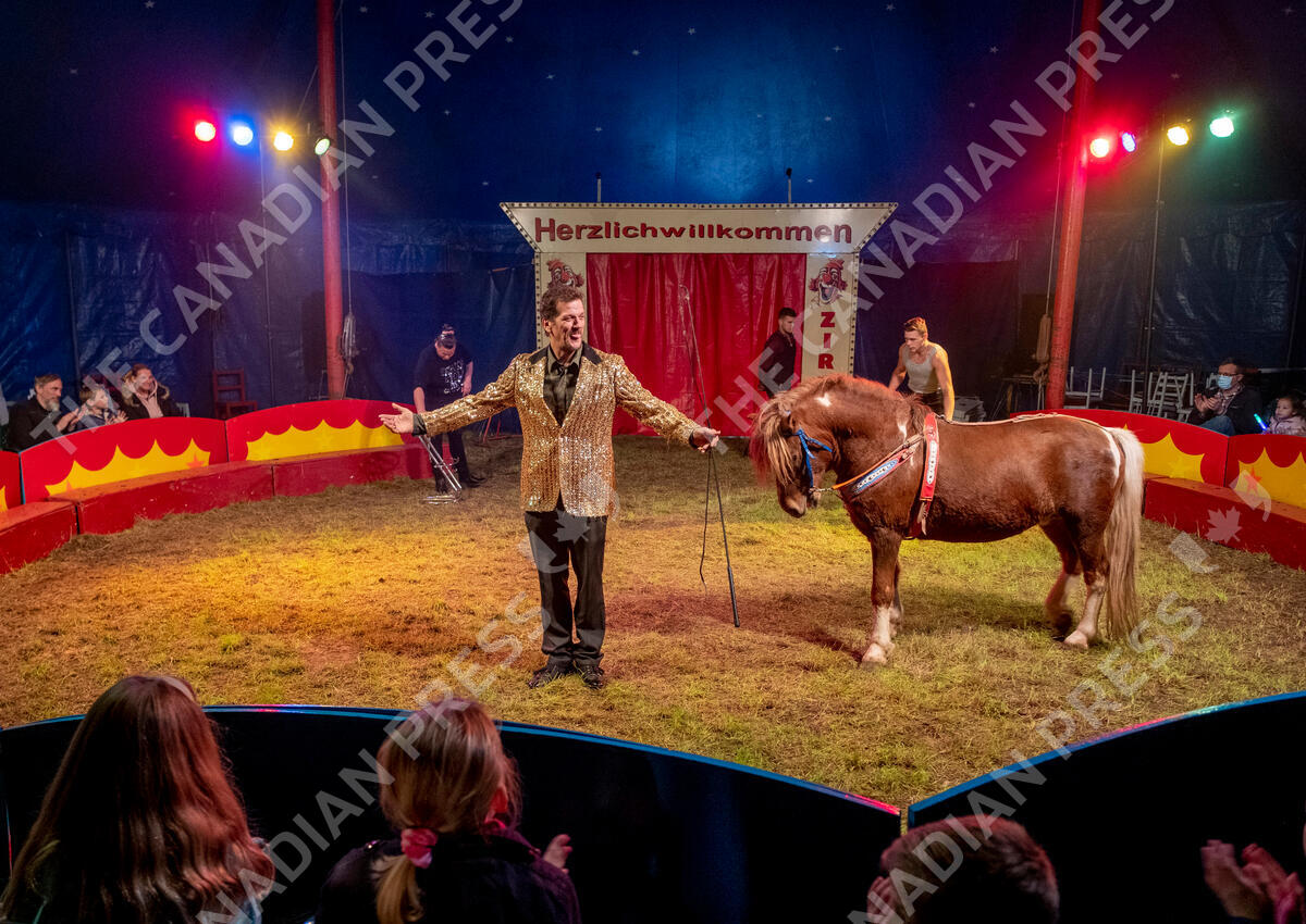 Circus director Tino Kraemer shows a horse during a performance of small circus Delmonde in Frankfurt, Germany, Saturday, Oct. 31, 2020. As Germany embarks Monday on a four-week partial lockdown, the family-run circus joins theaters, cinemas, sports facilities, restaurants and bars across the country in shutting down and hoping for the best. (AP Photo/Michael Probst)