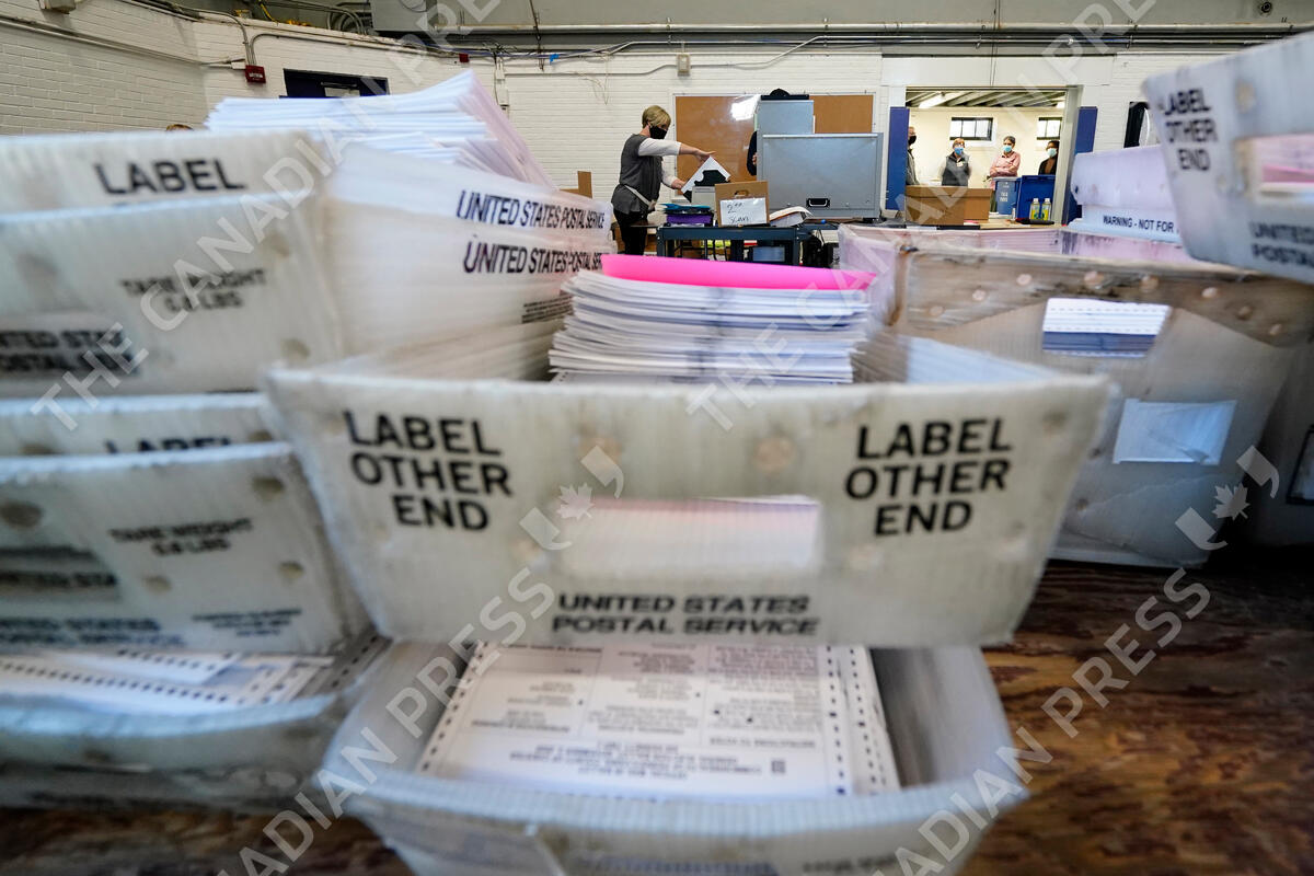 Chester County election workers scan mail-in and absentee ballots for the 2020 general election in the United States at West Chester University, Wednesday, Nov. 4, 2020, in West Chester, Pa. (AP Photo/Matt Slocum)