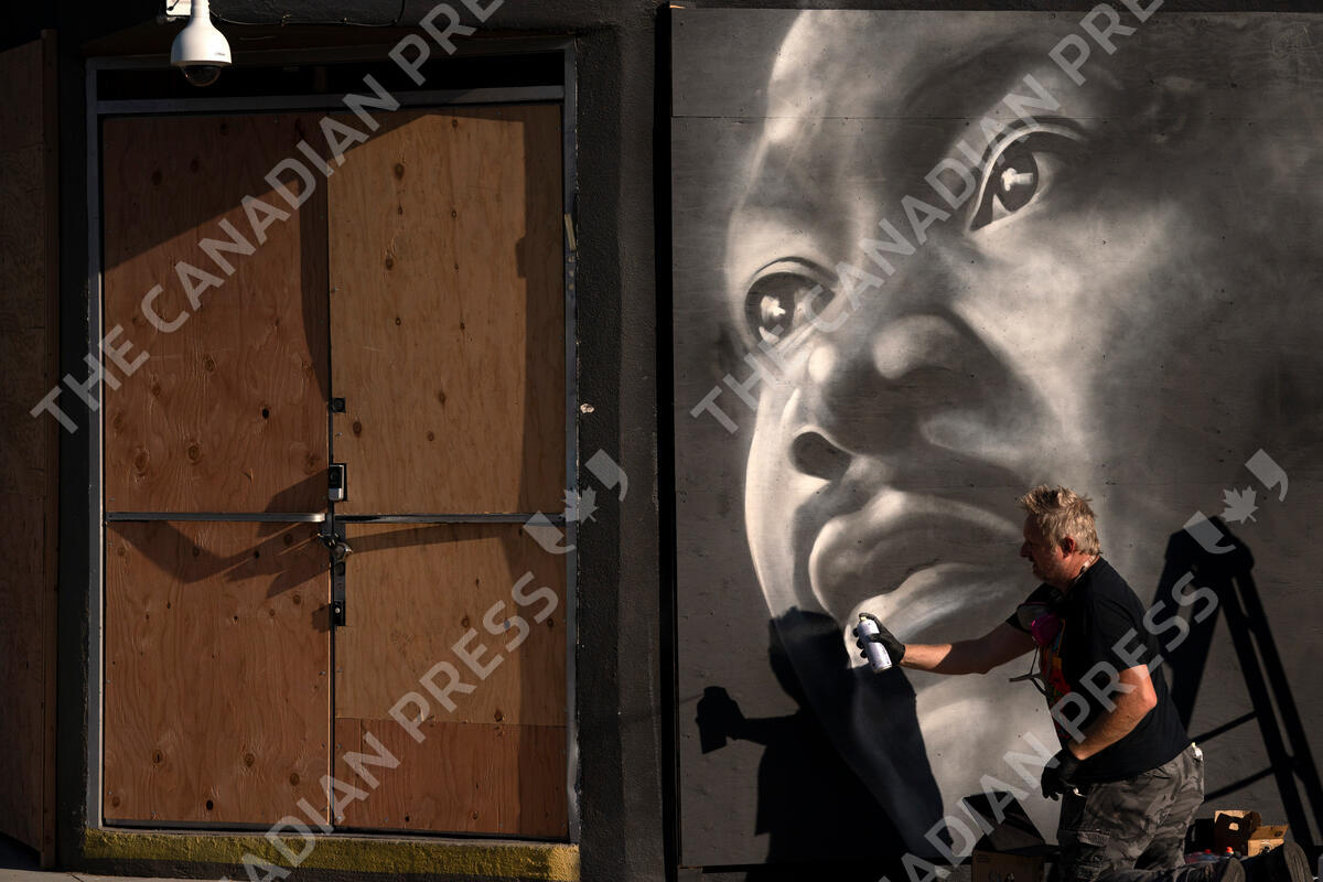 CORRECTS ARTIST LAST NAME TO GRAMMER FROM GRAMMAR - Artist Shane Grammer paints a portrait of Martin Luther King Jr. on the sheets of plywood outside a boarded-up jewelry shop amid worries about potential demonstrations and violent responses to the general election on Monday, Nov. 2, 2020, in Los Angeles. (AP Photo/Jae C. Hong)