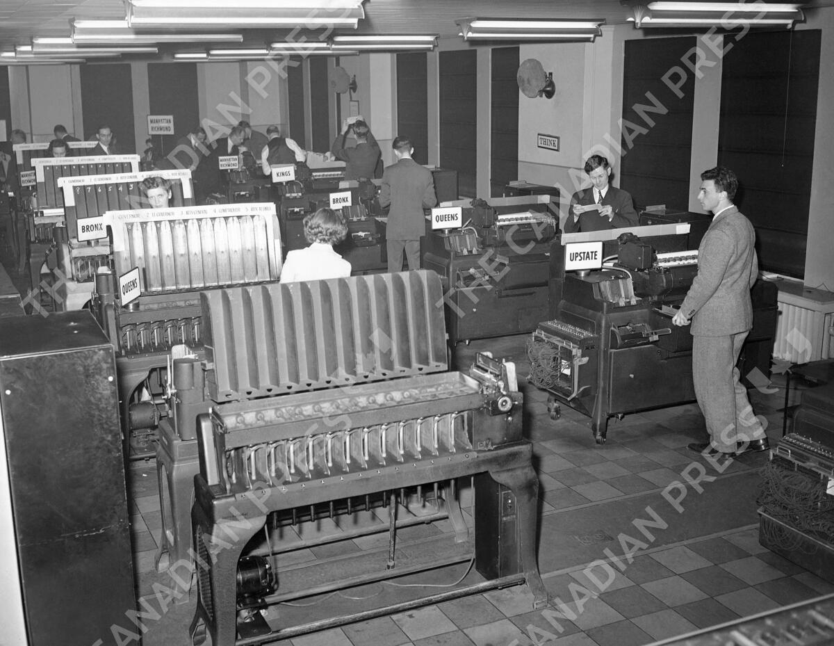 This battery of tabulating machines plays an important part in the gathering of the election returns by the Associated Press in New York, Nov. 3, 1942. The returns, coming in by teletype, are classified and counted with the aid of these and other machines of special design. (AP Photo/Matty Zimmerman)