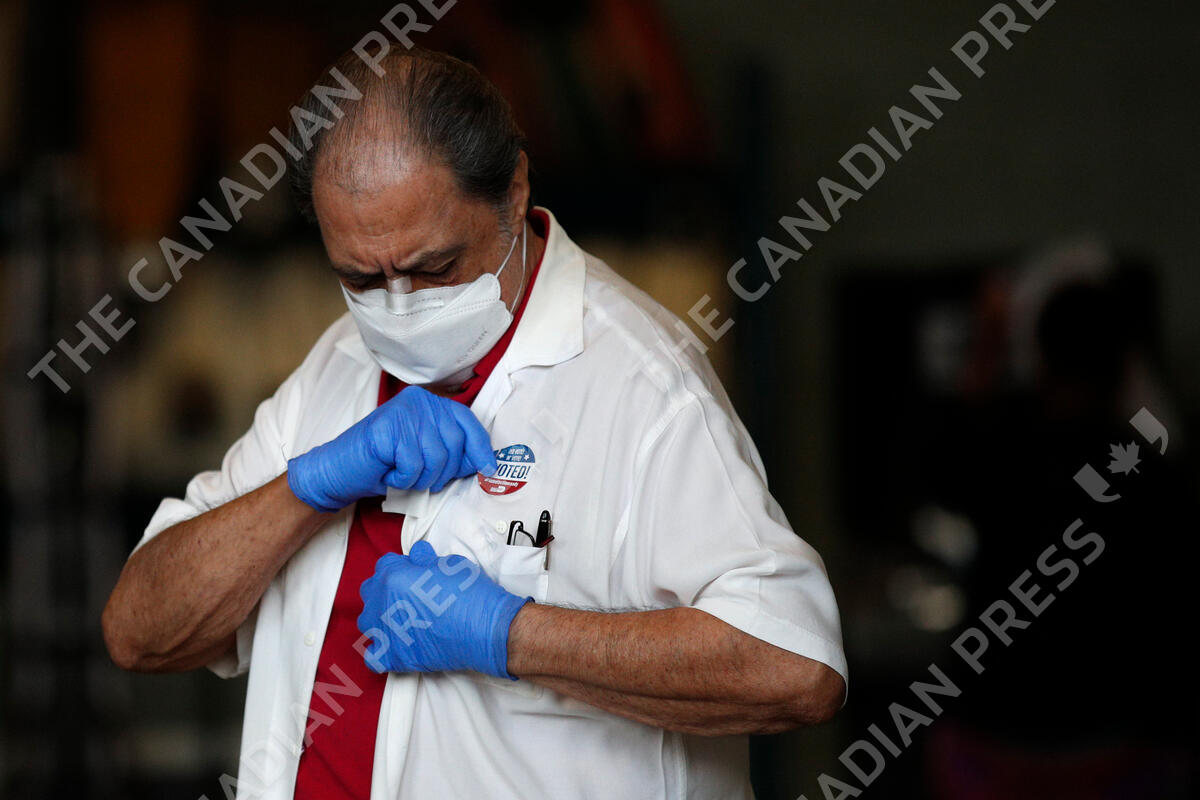A man wearing gloves and a mask to protect against COVID-19 affixes an "I voted" sticker to his shirt as he leaves a polling place at Indian Creek Fire Station #4 in Miami Beach, Fla., on Election Day, Tuesday, Nov. 3, 2020.(AP Photo/Rebecca Blackwell)
