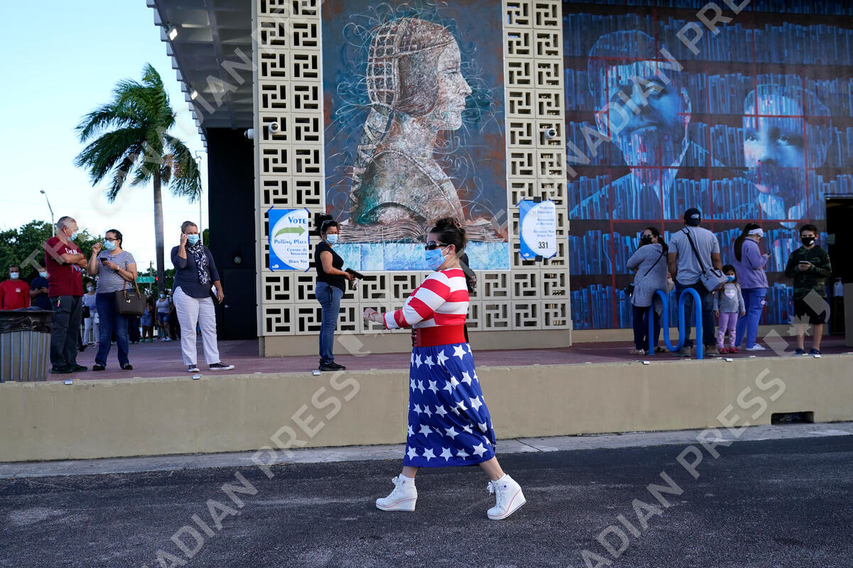 Yanitza Martinez wears red, white, and blue as she arrives to vote outside of the John F. Kennedy Library during the general election, Tuesday, Nov. 3, 2020, in Hialeah, Fla. (AP Photo/Lynne Sladky)