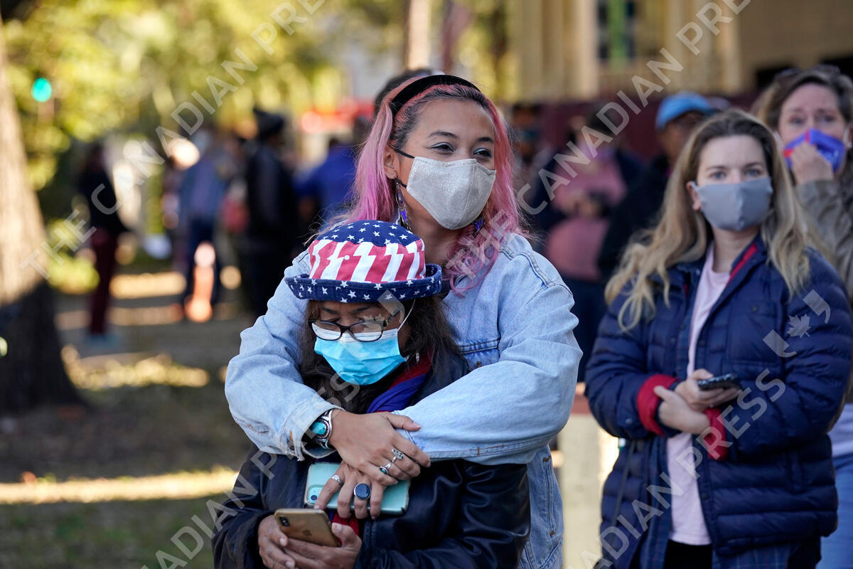 Erin Doherty hugs her mother Susanna Dew, 61, who is voting for the first time in her life, as they wait in line at a polling place on election day in the Mid City section of New Orleans, Tuesday, Nov. 3, 2020. (AP Photo/Gerald Herbert)