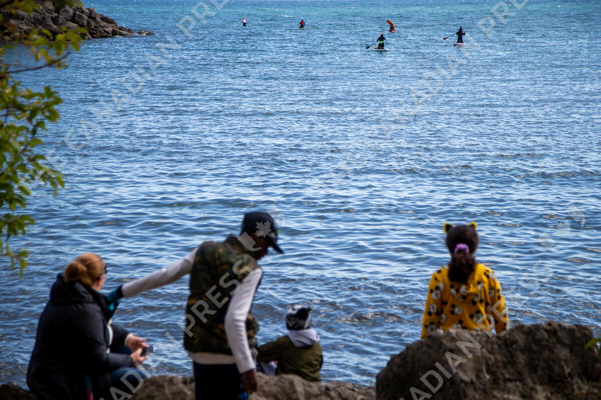 People look on as embers of the Buddy Standup Paddleboard group organized a Halloween Paddle Event which collected non-perishable food items for the Toronto Food Not Bombs organization. The group departed from Humber Bay Park West and completed a five-kilometre loop in Toronto on Saturday, October 17, 2020. THE CANADIAN PRESS/Carlos Osorio