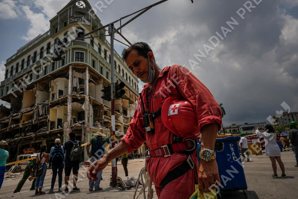 A member of the Cuban Red Cross takes a break after working in the rubble at the site of a deadly explosion that destroyed the five-star Hotel Saratoga in Old Havana, Cuba, Monday, May 9, 2022. (AP Photo/ Ramon Espinosa)