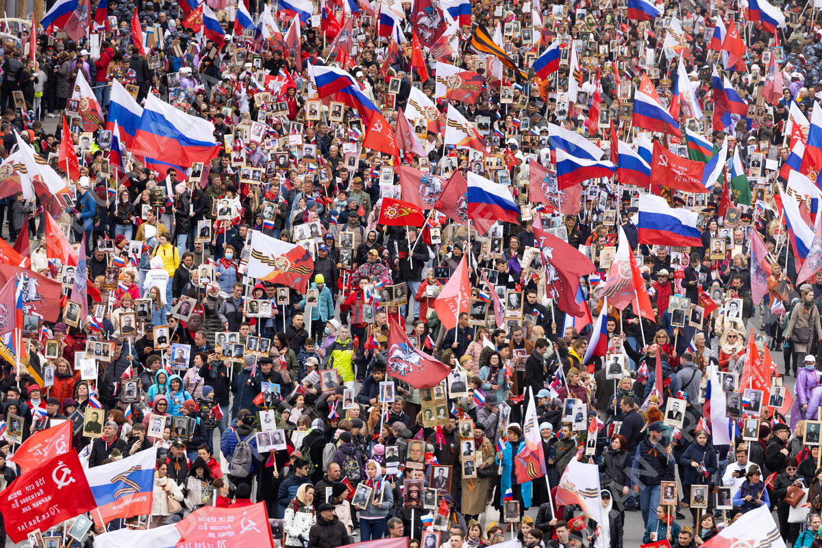 People attend the Immortal Regiment march through the main street toward Red Square marking the 77th anniversary of the end of World War II, in Moscow, Russia, Monday, May 9, 2022. (AP Photo/Denis Tyrin)