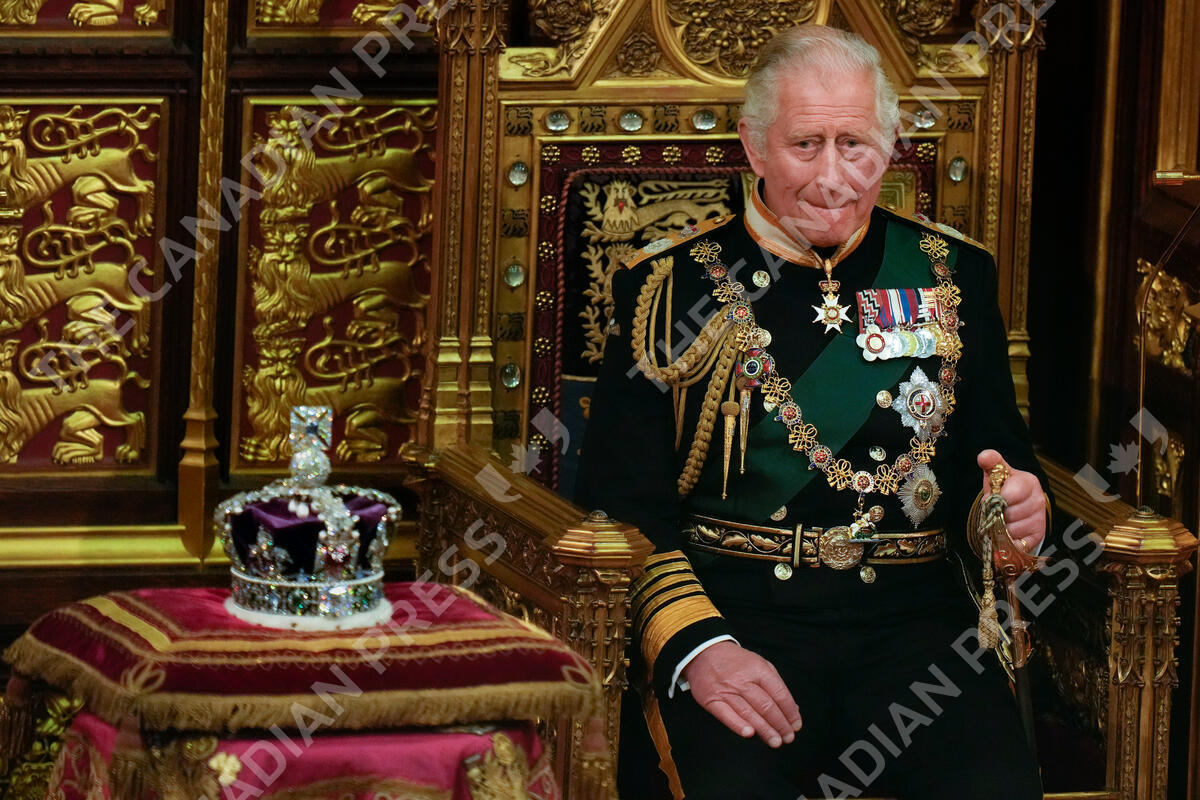 Prince Charles is seated next to the Queen's crown during the State Opening of Parliament, at the Palace of Westminster in London, Tuesday, May 10, 2022. Queen Elizabeth II did not attend the opening of Parliament amid ongoing mobility issues. (AP Photo/Alastair Grant, Pool)