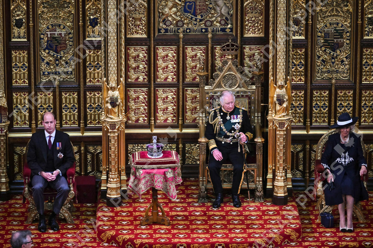 Britain's Prince Charles, center, sits by the The Imperial State Crown in the House of Lords Chamber, flanked by Britain's Prince William, left, and Camilla, Duchess of Cornwall, during the State Opening of Parliament, in the Houses of Parliament, in London, Tuesday, May 10, 2022. Britain’s Conservative government made sweeping promises to cut crime, improve health care and revive the pandemic-scarred economy as it laid the laws it plans in the next year in a tradition-steeped ceremony known as the Queen’s Speech -- but without a key player, Queen Elizabeth II, absent for the first time in six decades. The 96-year-old monarch pulled out of the ceremonial State Opening of Parliament because of what Buckingham Palace calls “episodic mobility issues.” Her son and heir, Prince Charles, stood in, rattling through a short speech laying out 38 bills the government plans to pass. (Ben Stansall/Pool Photo via AP)