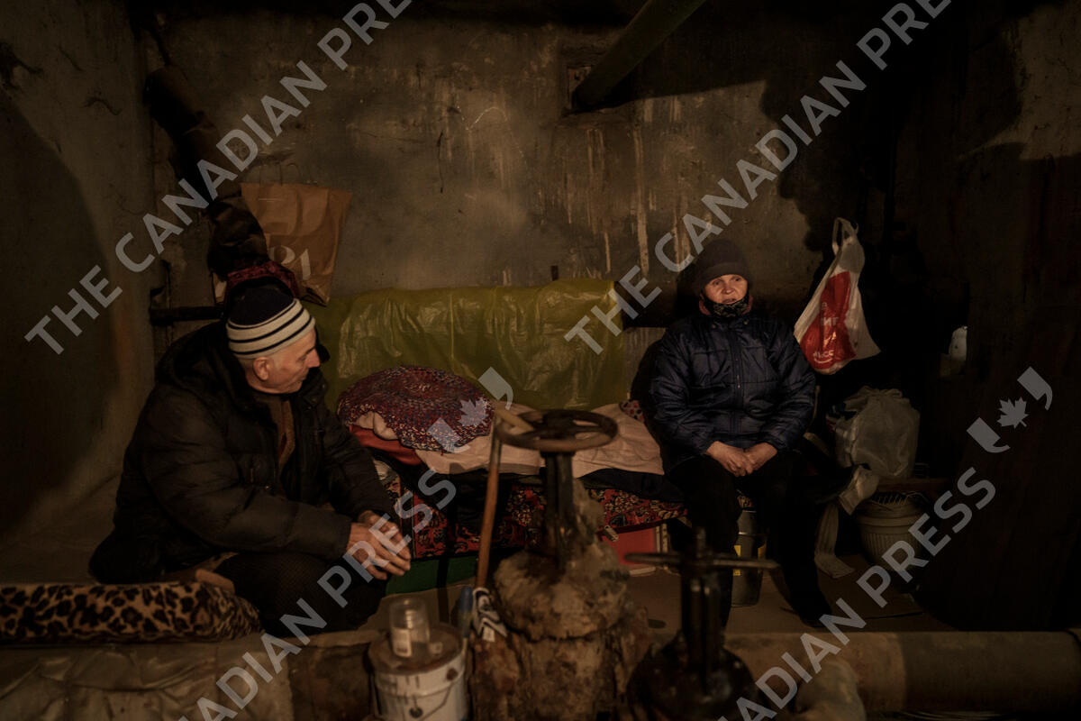 People take shelter inside the basement of a building during a Russian attack in Kharkiv, Ukraine, Saturday, April 23, 2022. (AP Photo/Felipe Dana)
