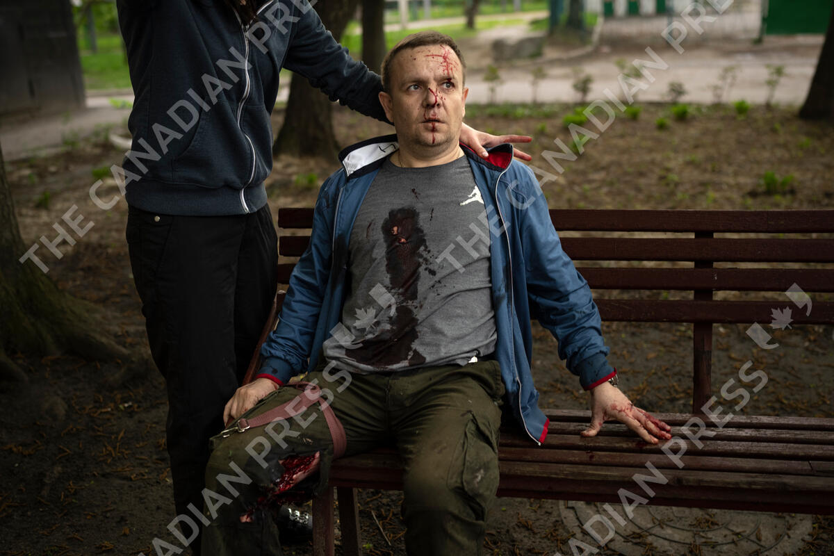 A man injured from shrapnel waits for emergency workers after a Russian bombardment in Kharkiv, Ukraine, Wednesday, April 27, 2022. (AP Photo/Felipe Dana)