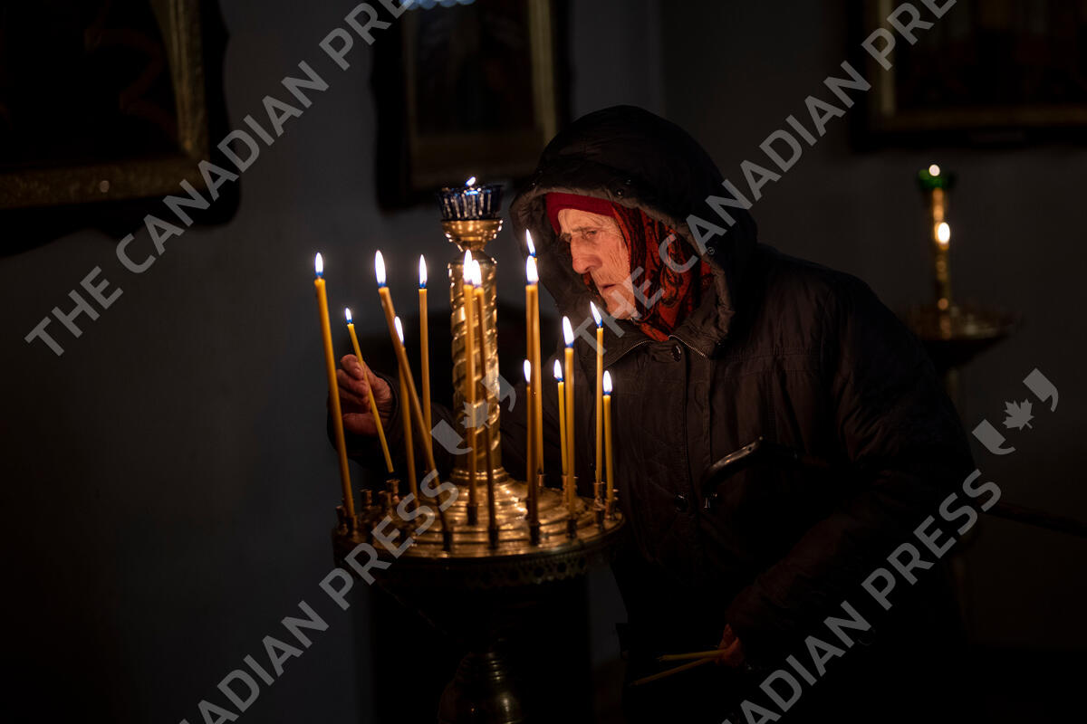 A woman lights candles during an Easter service at a church in Bucha on the outskirts of Kyiv, Ukraine, Sunday, April 24, 2022. (AP Photo/Emilio Morenatti)