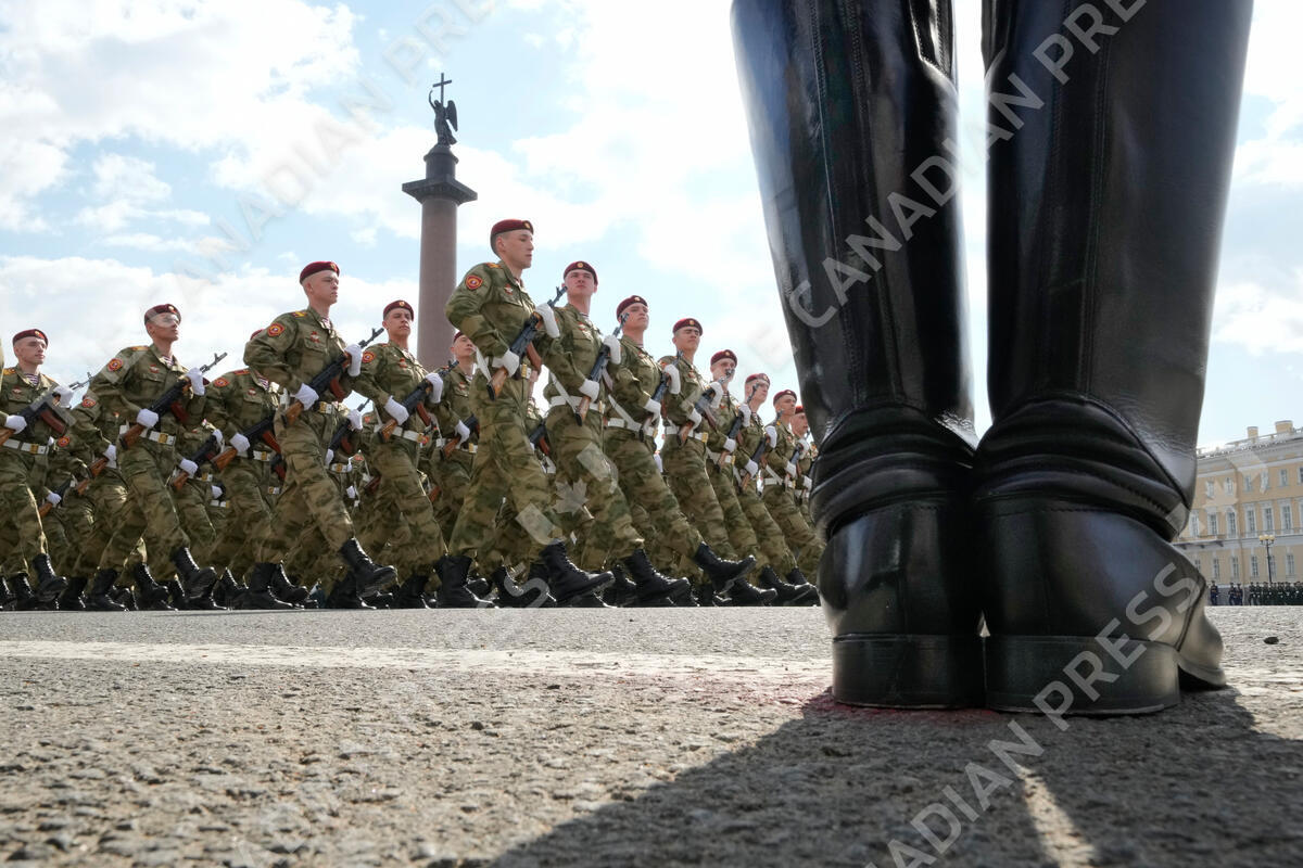 Troops march during a rehearsal for the Victory Day military parade which will take place at Dvortsovaya (Palace) Square on May 9 to celebrate 77 years after the victory in World War II in St. Petersburg, Russia, Saturday, May 7, 2022. (AP Photo/Dmitri Lovetsky)