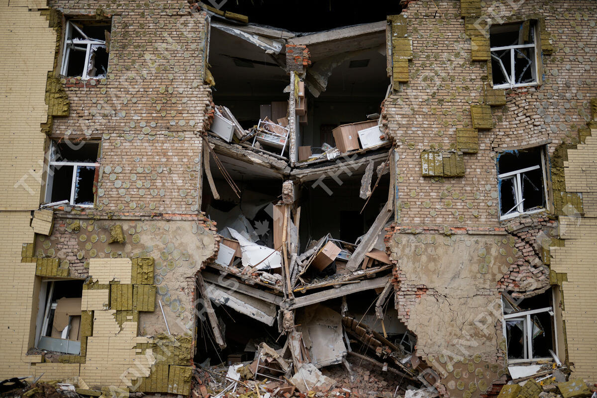 Debris hangs from a residential building heavily damaged in a Russian bombing in Bakhmut, eastern Ukraine, eastern Ukraine, Saturday, May 28, 2022. Fighting has raged around Lysychansk and neighbouring Sievierodonetsk, the last major cities under Ukrainian control in Luhansk region. (AP Photo/Francisco Seco)