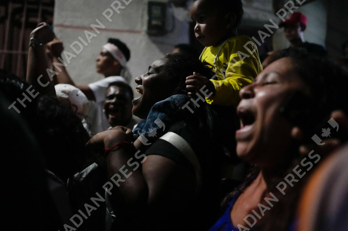 Residents chant during an overnight Catholic procession of a statue of San Juan Bautista, marking the start of a month-long celebration of the Saint in the neighborhood of San Agustin in Caracas, Venezuela, early Wednesday, June 1, 2022. The small statue of Saint John the Baptist, which was paraded through the streets, was in the custody of a family for the entire year and will be given to another family to protect until next year. (AP Photo/Ariana Cubillos)