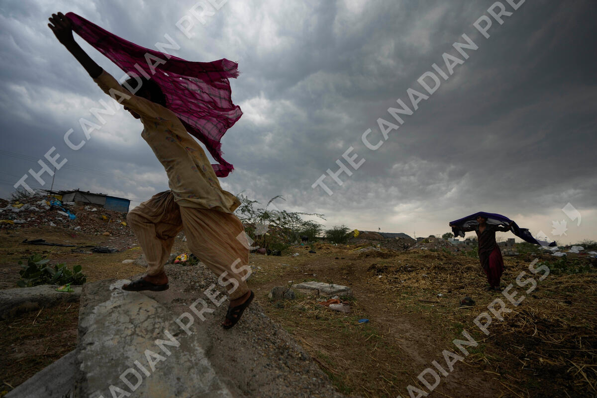 Nomadic Gujjar girls hold their scarves over their heads, as rain clouds hover in Jammu, India, Monday, May 30, 2022. The monsoon rains which usually hit India from June to September are crucial for farmers whose crops feed hundreds of millions of people. (AP Photo/Channi Anand)