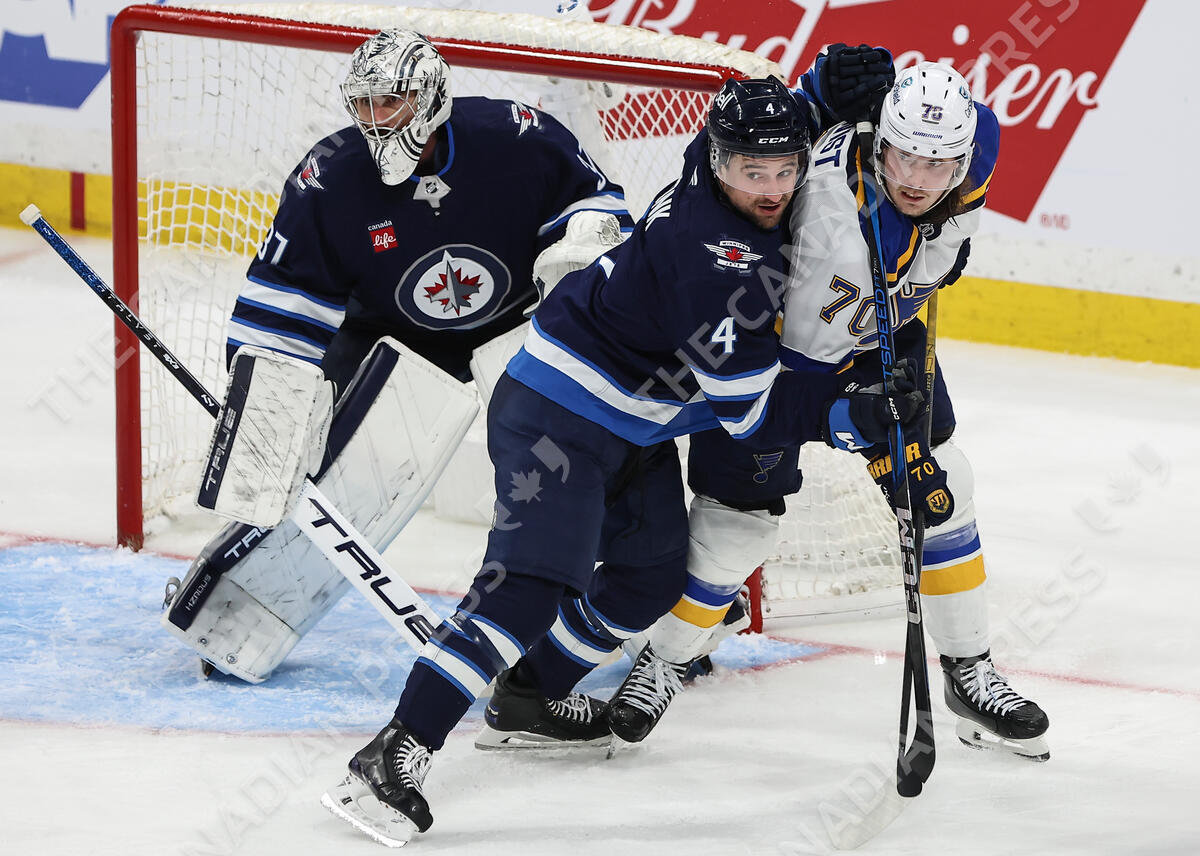 Winnipeg Jets' Neal Pionk (4) defends against St. Louis Blues' Oskar Sundqvist (70) in front of goaltender Connor Hellebuyck (37) during third period NHL playoff action in Winnipeg on Wednesday, April 30, 2025. THE CANADIAN PRESS/John Woods