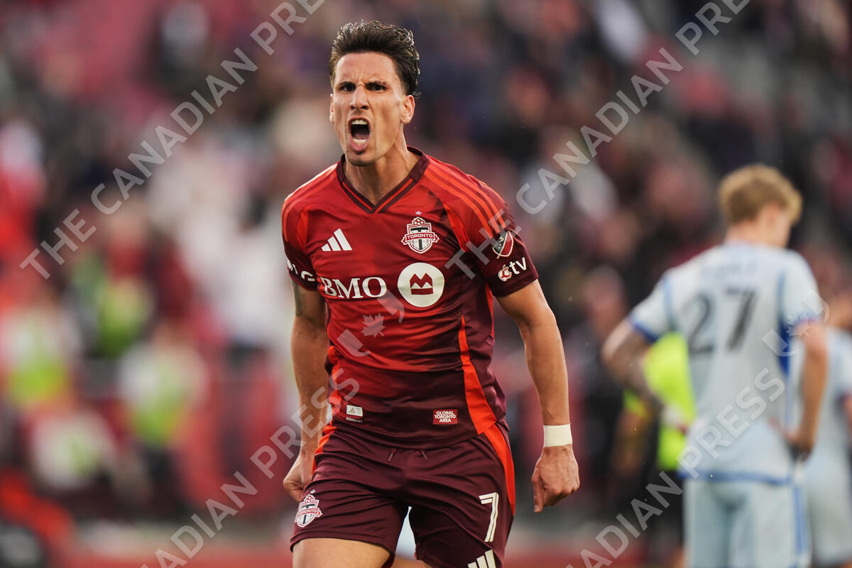 Toronto FC's Theo Corbeanu (7) celebrates his goal against CF Montreal during first half Canadian Championship preliminary round soccer action in Toronto on Wednesday, April 30, 2025. THE CANADIAN PRESS/Frank Gunn