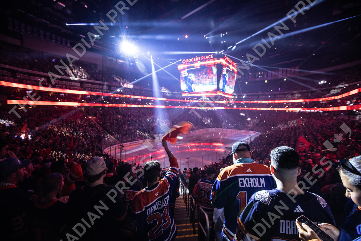 Fans cheer before the Los Angeles Kings and Edmonton Oilers take the ice during NHL playoff action in Edmonton on Thursday, May 1, 2025. THE CANADIAN PRESS/Jason Franson