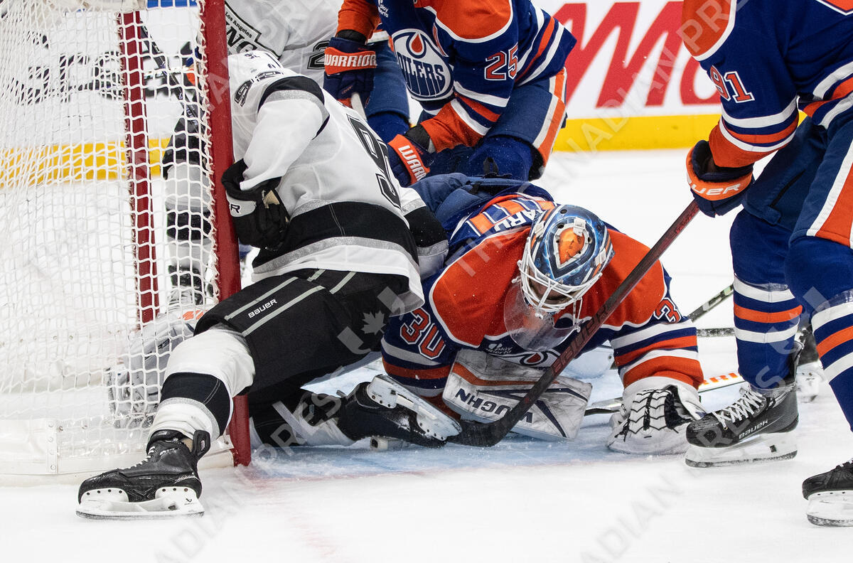 Los Angeles Kings' Brandt Clarke (92) crashes the net as Edmonton Oilers goalie Calvin Pickard (30) makes the save during third period NHL playoff action in Edmonton on Thursday, May 1, 2025. THE CANADIAN PRESS/Jason Franson