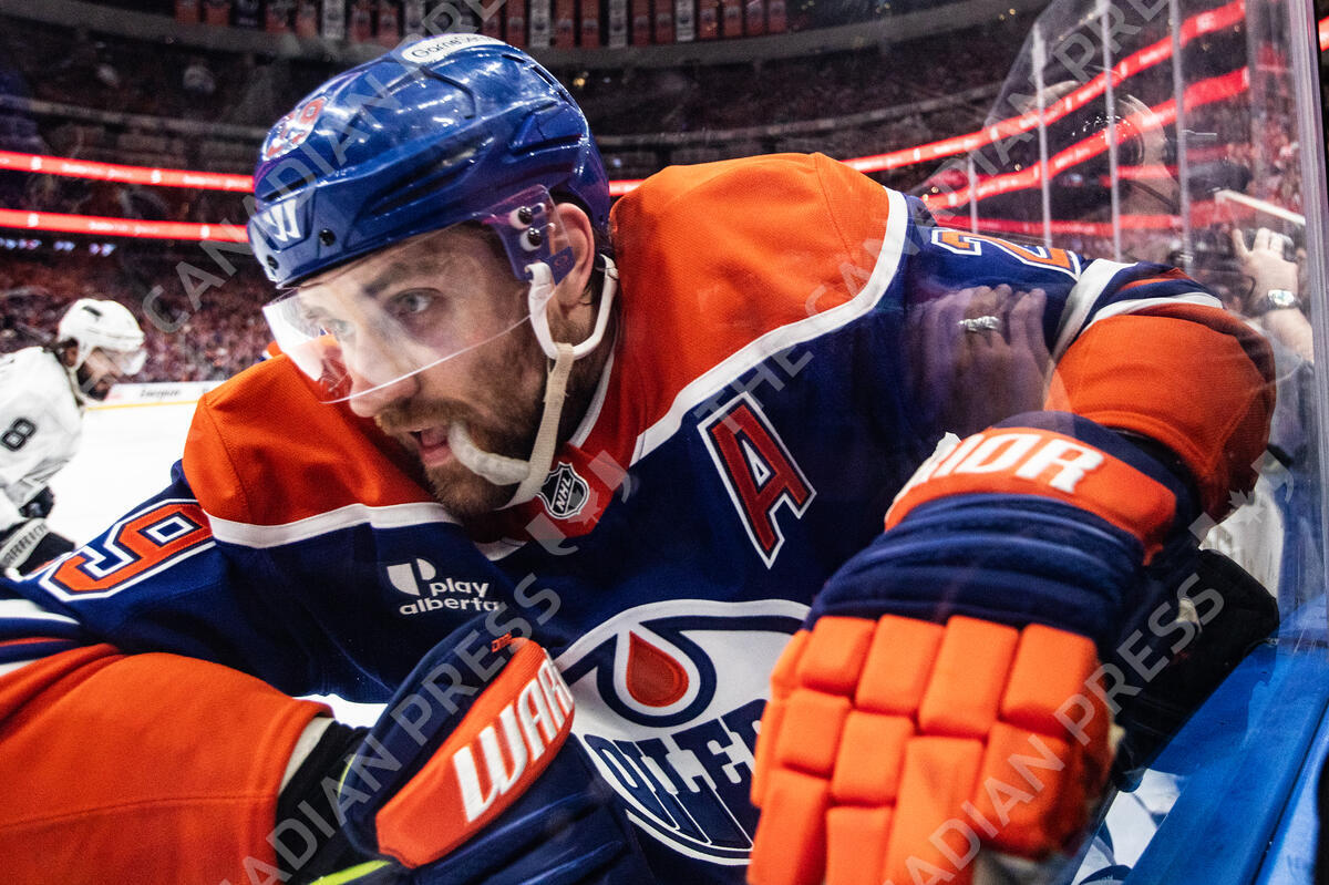 Edmonton Oilers' Leon Draisaitl (29) battles in the corner against the Los Angeles Kings during second period NHL playoff action in Edmonton on Thursday, May 1, 2025. THE CANADIAN PRESS/Jason Franson