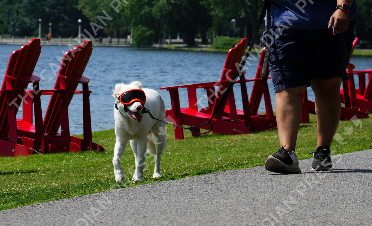 Ted wears tinted goggles while being walked along Dow's Lake by owner Tracy Carver in Ottawa on Monday, July 28, 2025, while temperatures hit 33 degrees. THE CANADIAN PRESS/Sean Kilpatrick