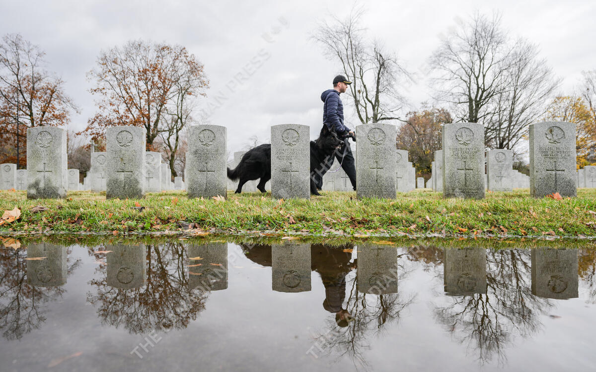 A man walks past tombstones marking Canadian Armed Forces veterans in Notre-Dame-des-Neiges Cemetery in Montreal on Monday, Nov. 11, 2024. THE CANADIAN PRESS/Christinne Muschi