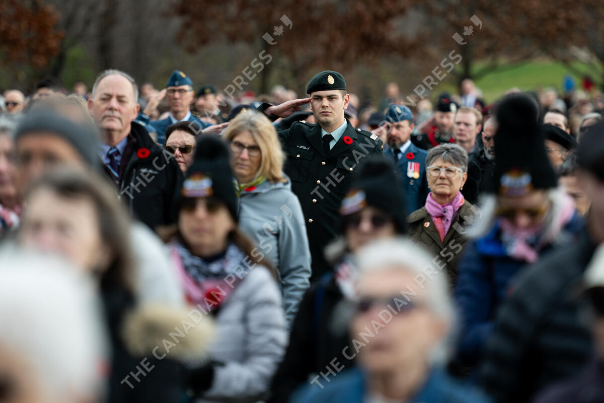 A Canadian Armed Forces member salutes during a Remembrance Day commemorative event at the National Military Cemetery at Beechwood Cemetery in Ottawa, on Monday, Nov. 11, 2024. THE CANADIAN PRESS/Spencer Colby
