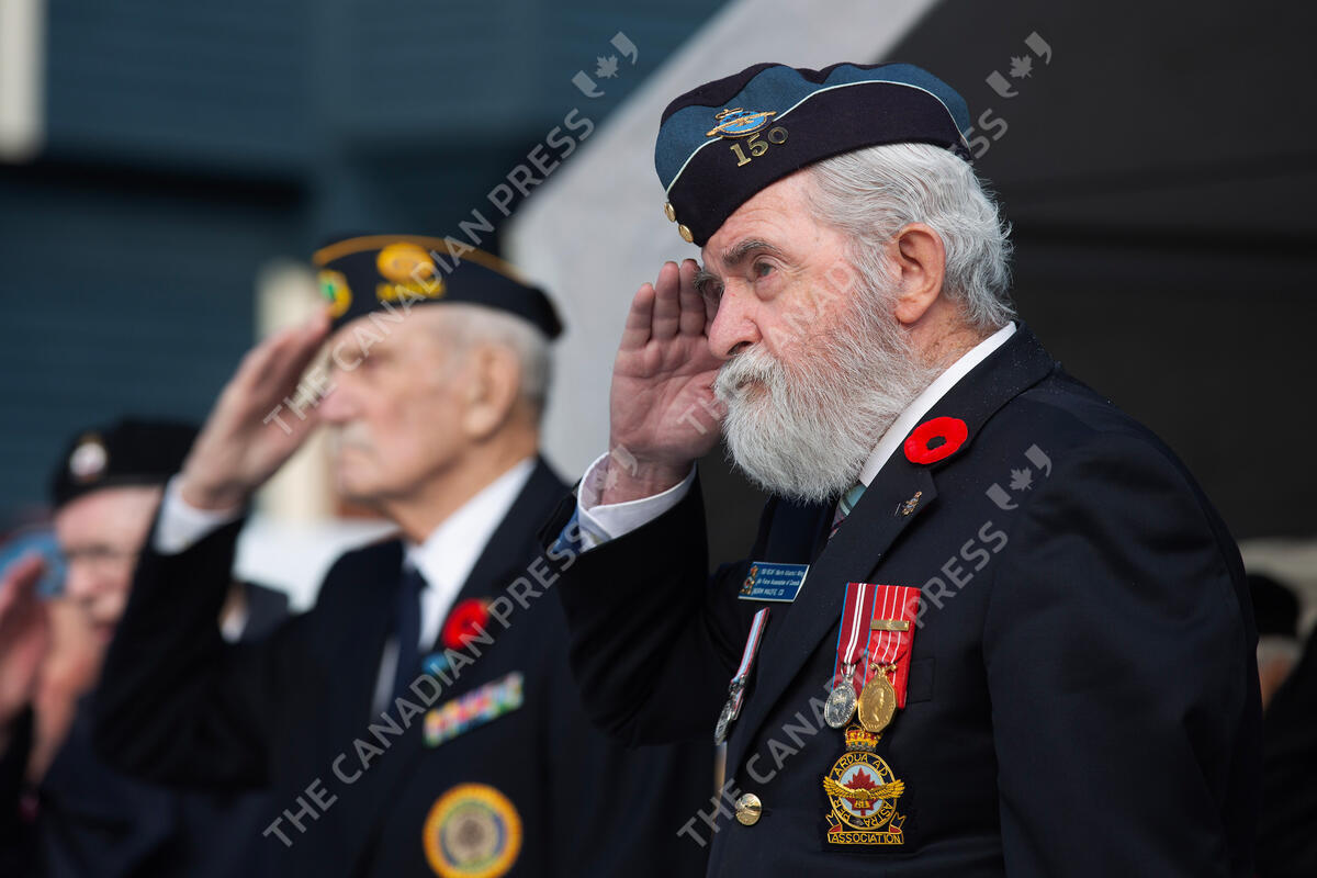 Ray Reiser (left), US Air Force and Norm Macfie 150 RCAF Wing salute during the Remembrance Day ceremony at the Newfoundland and Labrador National War Monument in St.John's, Monday, November 11, 2024. THE CANADIAN PRESS/Paul Daly