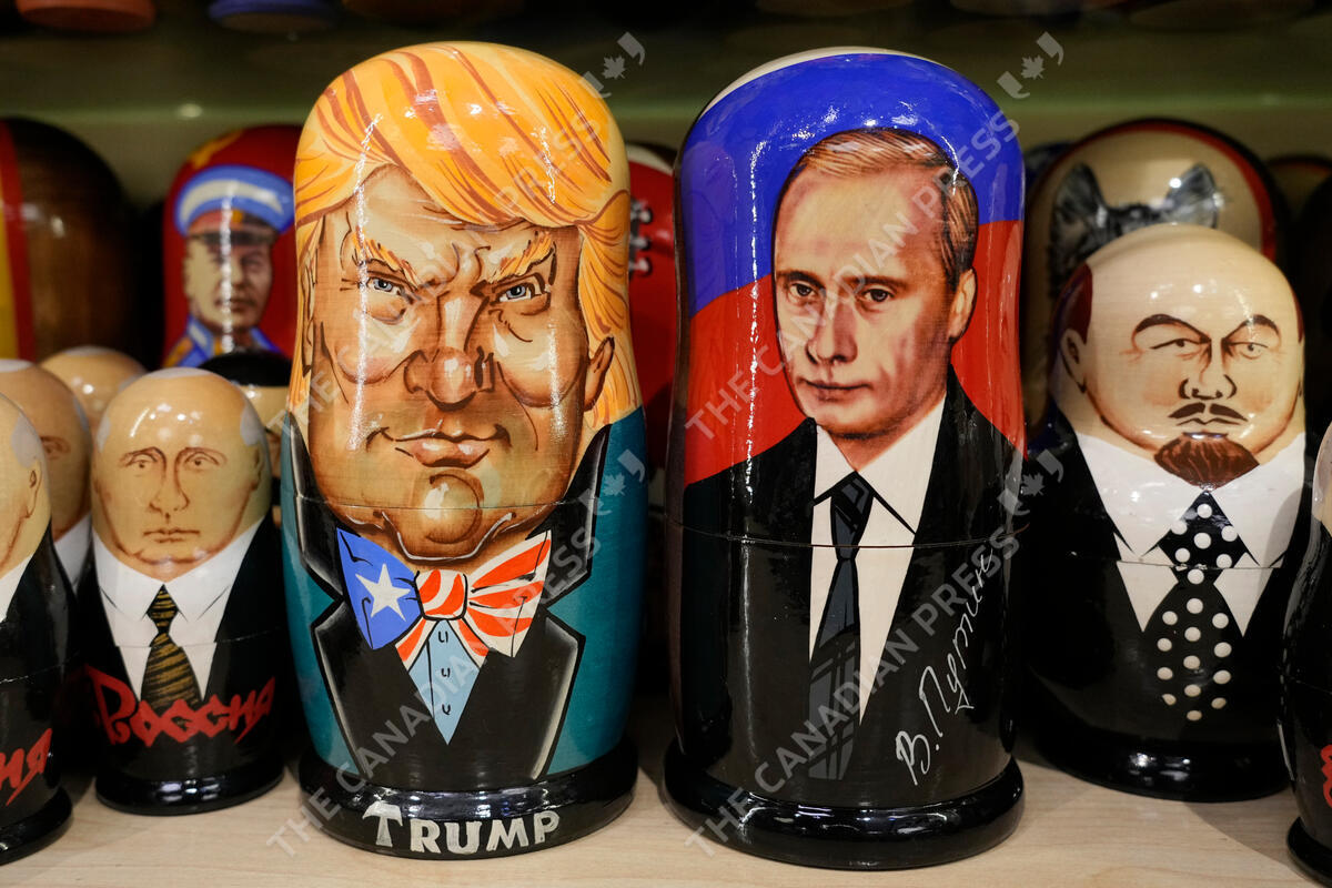 Traditional Russian wooden dolls, Matryoshka, depicting U.S. President-elect Donald Trump and Russia's President Vladimir Putin are displayed for sale at a souvenir shop in St. Petersburg, Russia, Wednesday, Nov. 6, 2024. (AP Photo/Dmitri Lovetsky)