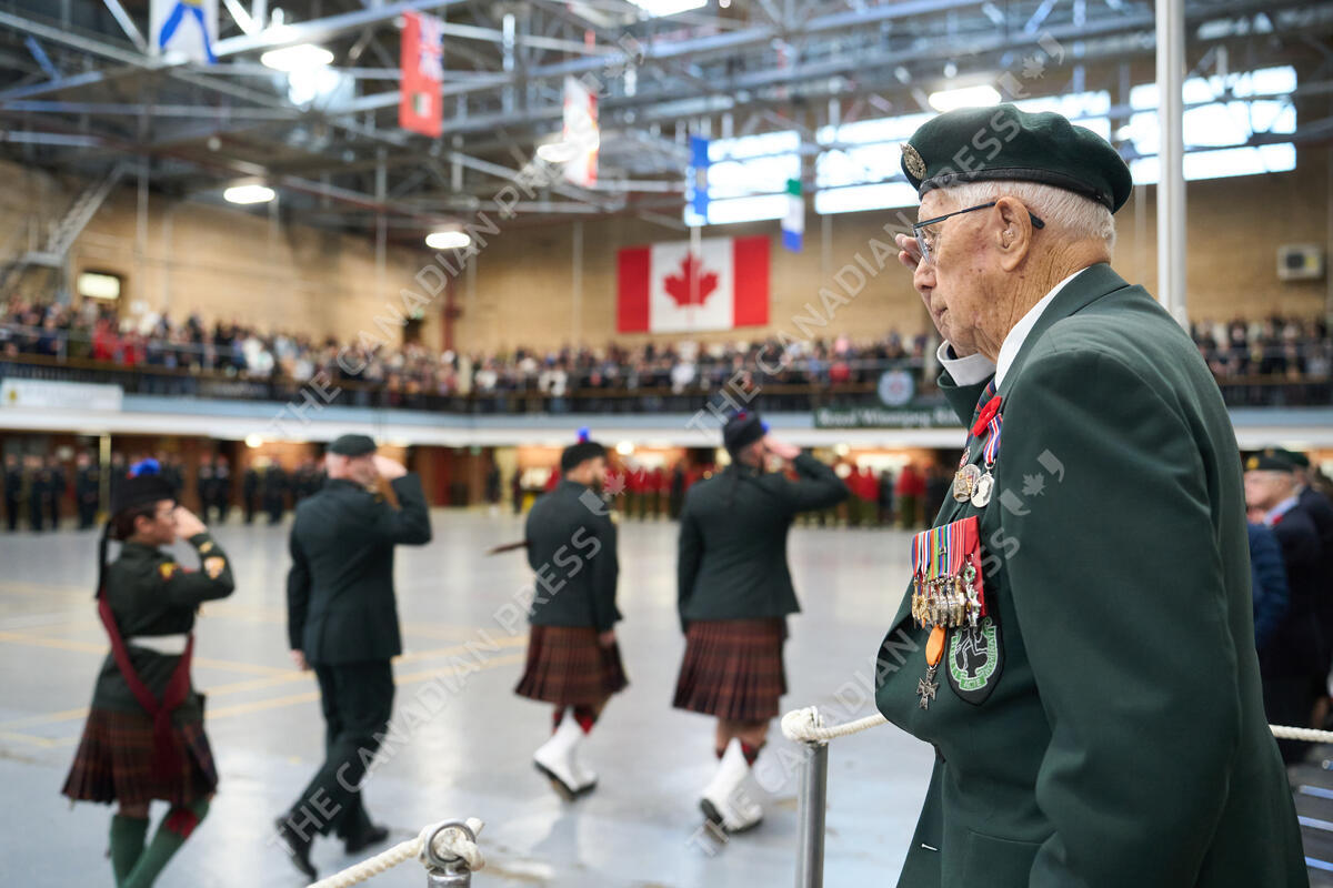 Guest of Honour Rifleman Jim Parks takes part in the Remembrance Day ceremony at the Minto Armoury in Winnipeg on Monday, November 11, 2024. THE CANADIAN PRESS/David Lipnowski