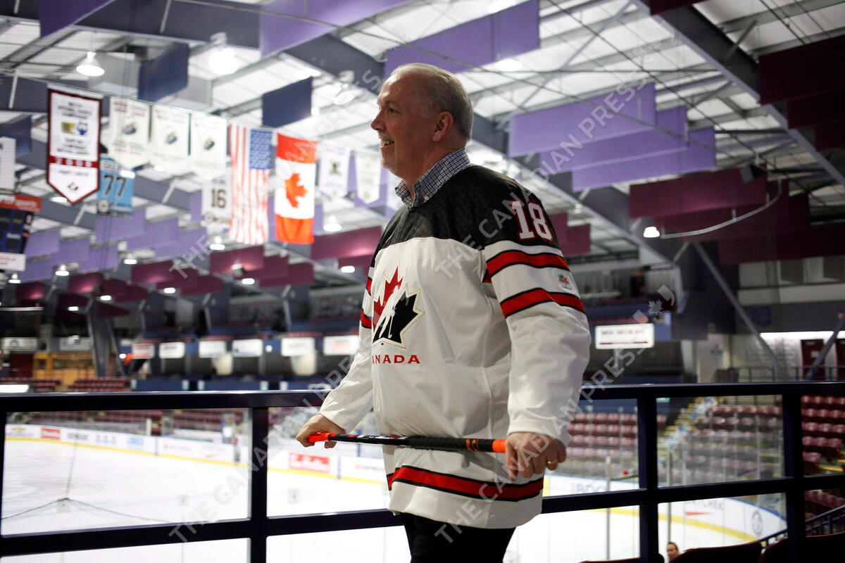 Premier John Horgan looks on after taking a couple shots on net against Celly the junior hockey mascot before Team Canada hopefuls practice during selection camp at the Q Centre in Victoria, Tuesday, Dec. 11, 2018. Horgan, former B.C. premier, Canada's ambassador to Germany and a five term member of the provincial legislature, has died following his third battle with cancer. He was 65 years old. THE CANADIAN PRESS/Chad Hipolito