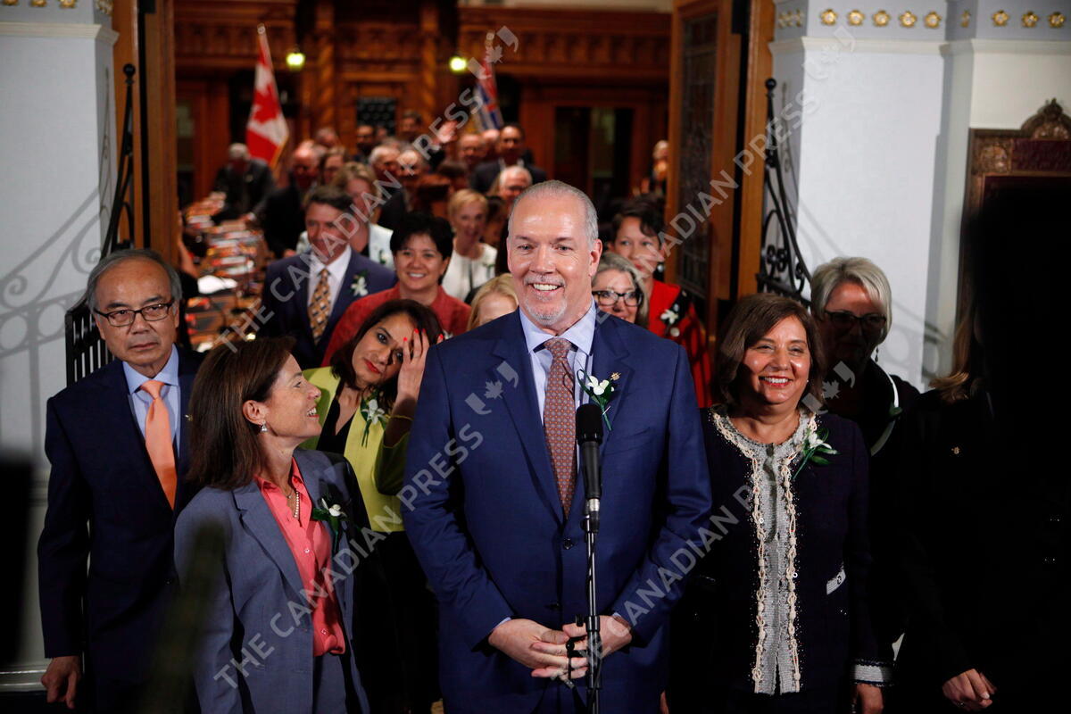 B.C. NDP leader John Horgan speaks to media following a swearing-in ceremony at Legislature in Victoria, Thursday, June 8, 2017. Horgan, former B.C. premier, Canada's ambassador to Germany and a five term member of the provincial legislature, has died following his third battle with cancer. He was 65 years old. THE CANADIAN PRESS/Chad Hipolito