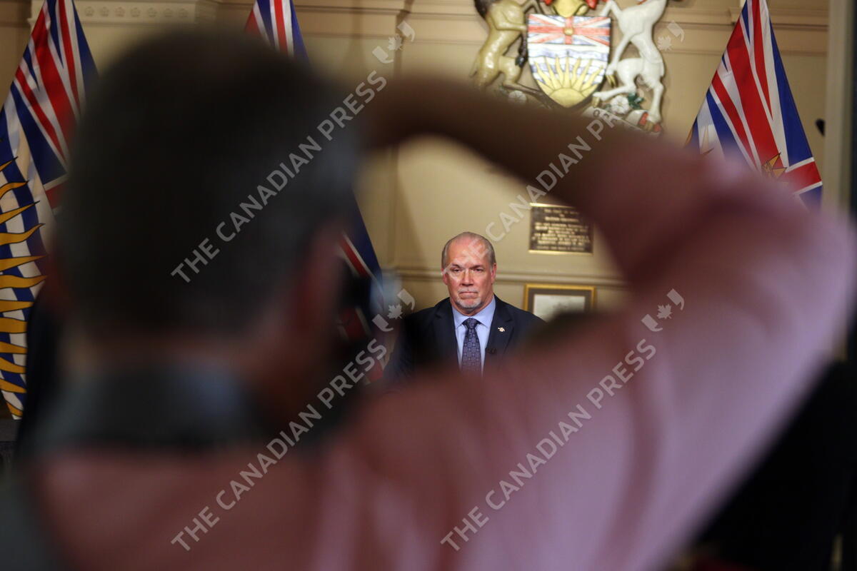 Premier John Horgan is joined by Provincial Health Officer Dr. Bonnie Henry and Health Minister Adrian Dix as they discuss reopening the province's economy in phases in response to the COVID-19 pandemic during a press conference in the rotunda at Legislature in Victoria, May 6, 2020. Horgan, former B.C. premier, Canada's ambassador to Germany and a five term member of the provincial legislature, has died following his third battle with cancer. He was 65 years old. THE CANADIAN PRESS/Chad Hipolito