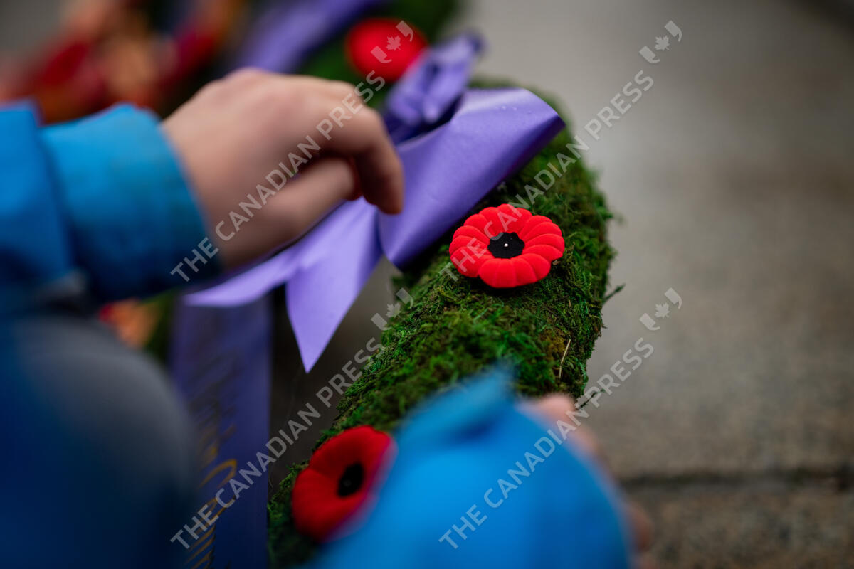 A boy places a poppy on a wreath during a Remembrance Day ceremony at Victory Square in Vancouver, on Monday, November 11, 2024. THE CANADIAN PRESS/Ethan Cairns