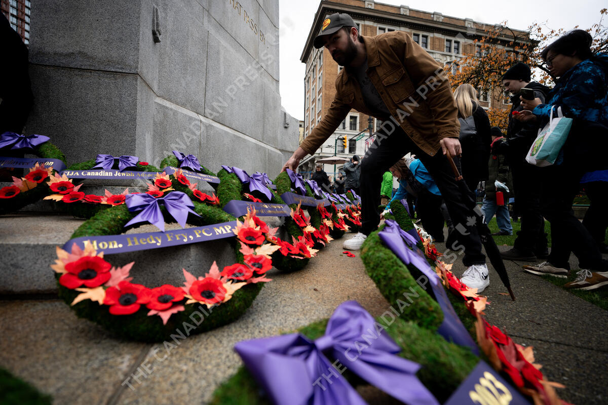 A man places a poppy on a wreath during a Remembrance Day ceremony at Victory Square in Vancouver, on Monday, November 11, 2024. THE CANADIAN PRESS/Ethan Cairns