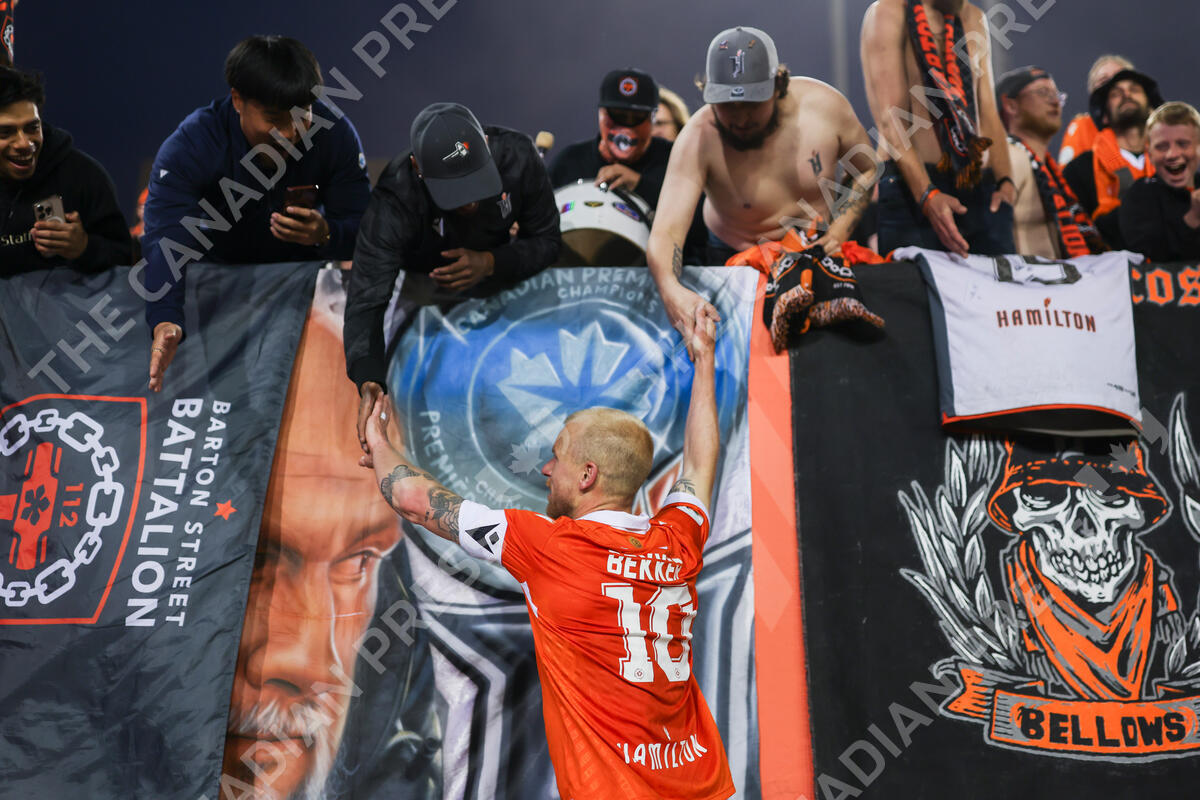 Kyle Bekker (10) of Hamilton Forge FC celebrates with supporters following their Canadian Championship quarterfinal win over CF Montreal in Hamilton on Tuesday, May 20, 2025. THE CANADIAN PRESS/Nick Iwanyshyn