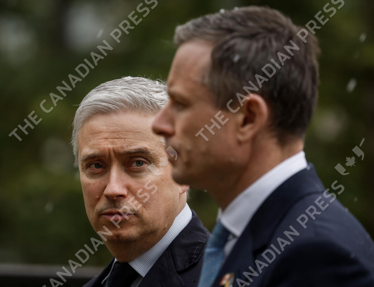 Ukraine Minister of Finance, Sergii Marchenko, right, and Canada's Finance Minister Francois-Philippe Champagne speak to the media prior to the G7 Finance Ministers meeting in Banff, Alta., Tuesday, May 20, 2025.THE CANADIAN PRESS/Jeff McIntosh