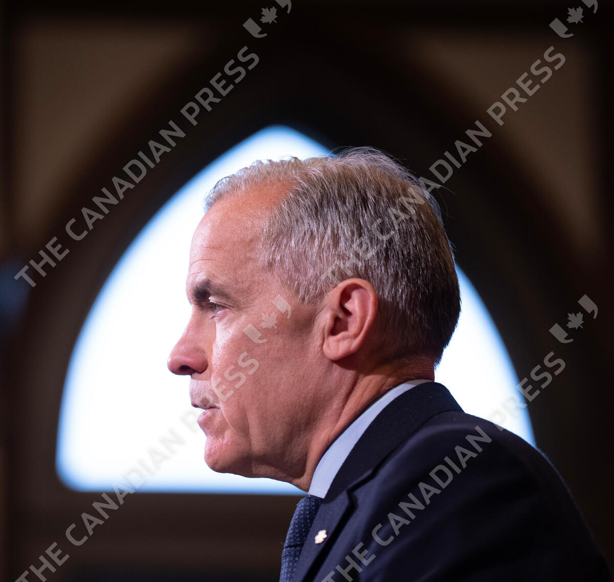 Prime Minister Mark Carney speaks with reporters during an availability following a cabinet retreat, Wednesday, May 21, 2025 in Ottawa. THE CANADIAN PRESS/Adrian Wyld