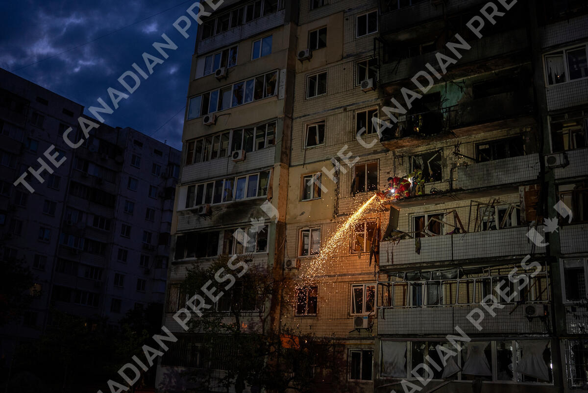 Firefighter clear debris from a balcony at a residential building damaged after a Russian attack in Kyiv, Ukraine, Saturday, May 24, 2025 (AP Photo/Alex Babenko)