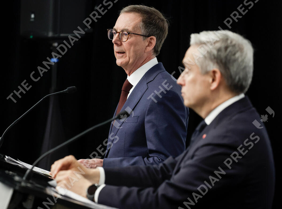 Canada's Finance Minister Francois-Philippe Champagne, right, and Governor of the Bank of Canada Tiff Macklem speak during the final news conference at the G7 Finance Ministers meeting in Banff, Alta., Thursday, May 22, 2025. THE CANADIAN PRESS/Jeff McIntosh