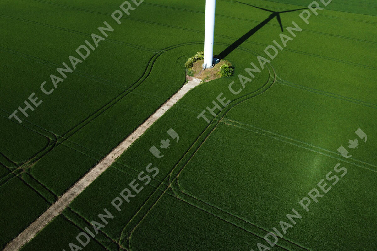 The shadow of a wind turbine falls on a field at a wind farm near Aschersleben, Germany, Monday, May 26, 2025. (AP Photo/Matthias Schrader)
