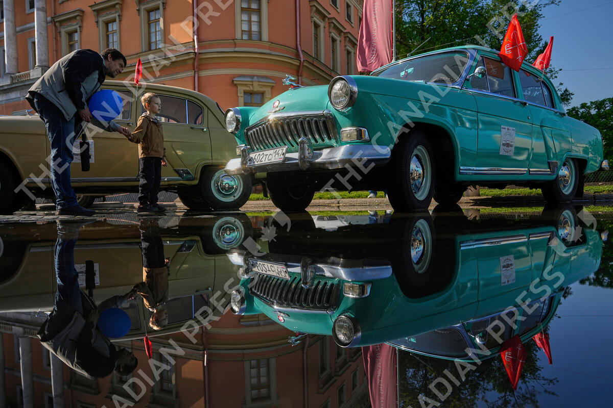 A man and a child examine a Soviet era GAZ M21 Volga car at a transport festival in St. Petersburg, Russia, Saturday, May 24, 2025. (AP Photo/Dmitri Lovetsky)